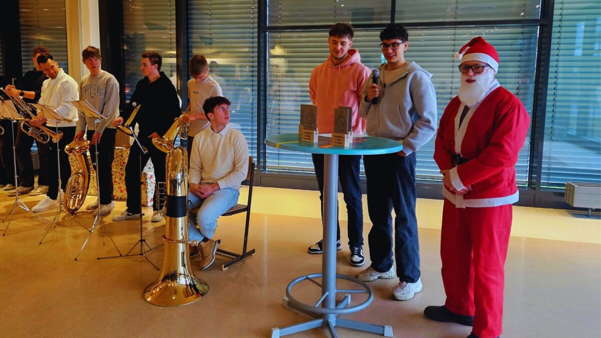 Nach der Begrüßung durch die Schülervertretung, vertreten durch Schulsprecher Jonas Kamper, wurden unter anderem die Siegerteams der schulweiten Fußball- und Volleyballturniere ausgezeichnet. In einem kurzen Rückblick wurde das Schuljahr 2025 aus verschiedenen Blickwinkeln beleuchtet.